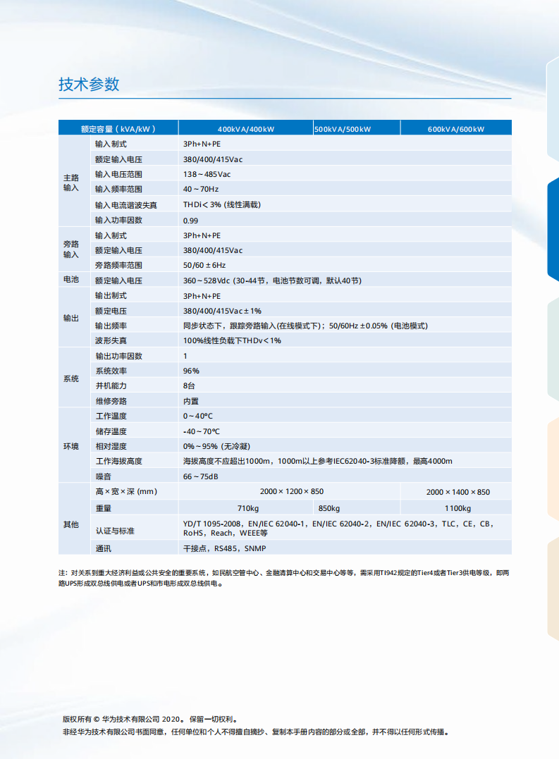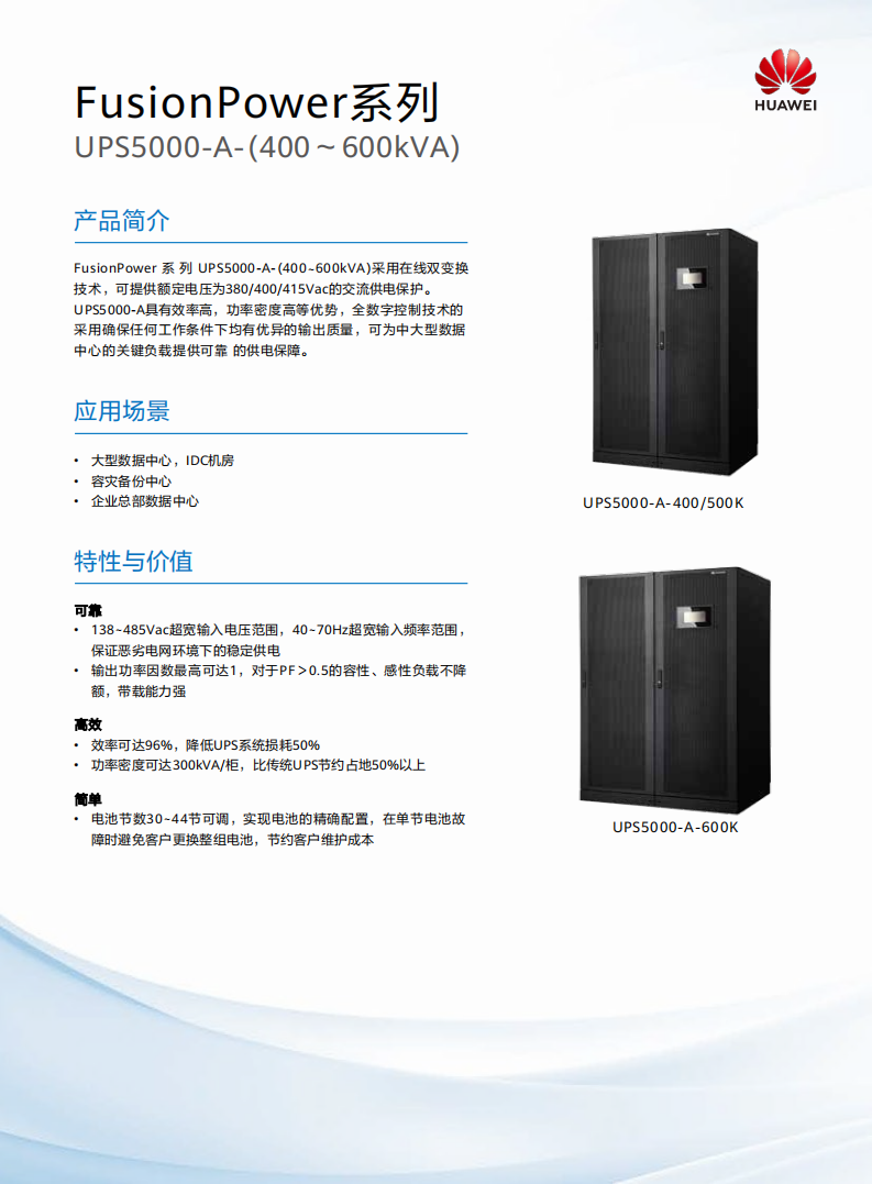 • UPS5000-A是面中小型数据中心及关键供电场景的塔式不间断电源UPS5000-A(400 ~ 600kVA)具有效率高,功率密度高等优势,全数字控制技术的采用确保任何工作条件下均有优异的输出质量,支持塔式安装,采用在线双变换技术,可全面消除各类电网问题,为客户提供稳定纯净的交流供电保护。全数字控制技术,抗千扰能力强,保障UPS在恶劣工况下也可稳定输出,可为中大型数据中心的关键负载提供可靠的供电保障。